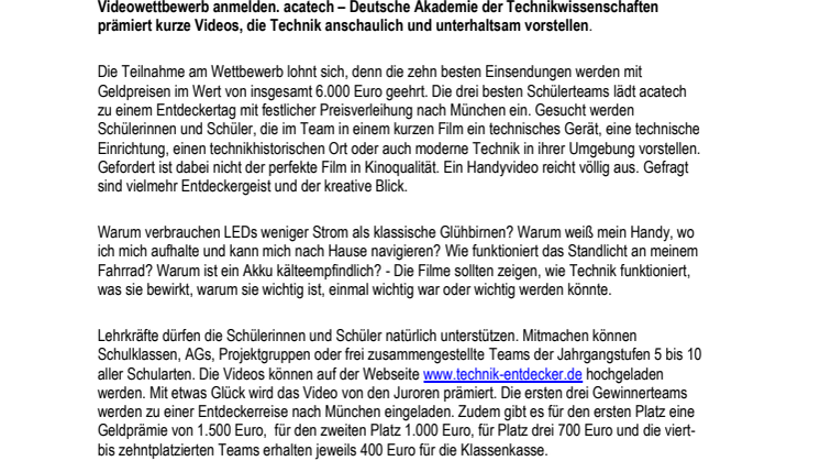 Die Teilnahme am Wettbewerb lohnt sich, denn die zehn besten Einsendungen werden mit Geldpreisen im Wert von insgesamt 6.000 Euro geehrt. Die drei besten Schülerteams lädt acatech zu einem Entdeckertag mit festlicher Preisverleihung nach München ein. Gesucht werden Schülerinnen und Schüler, die im Team in einem kurzen Film ein technisches Gerät, eine technische Einrichtung, einen technikhistorischen Ort oder auch moderne Technik in ihrer Umgebung vorstellen. Gefordert ist dabei nicht der perfekte Film in Kinoqualität. Ein Handyvideo reicht völlig aus. Gefragt sind vielmehr Entdeckergeist und der kreative Blick.