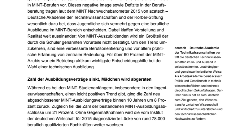 Wenig Kontakt mit Menschen, ein gefährlicher – und dazu noch kalter – Arbeitsplatz und körperlich anstrengende Aufgaben: So stellen sich viele Schülerinnen und Schüler die Arbeit in MINT-Berufen vor. Dieses negative Image sowie Defizite in der Berufsberatung tragen laut dem MINT Nachwuchsbarometer 2015 von acatech – Deutsche Akademie der Technikwissenschaften und der Körber-Stiftung wesentlich dazu bei, dass Jugendliche sich vermehrt gegen eine berufliche Ausbildung im MINT-Bereich entscheiden. Dabei klaffen Vorstellung und Realität weit auseinander: Von MINT-Auszubildenden wird ein Großteil der durch die Schüler genannten Vorurteile nicht bestätigt. Um den Trend umzukehren, sind eine verbesserte Berufsorientierung und vor allem praktische Erfahrung von zentraler Bedeutung. Für über 60 Prozent der MINT-Azubis war ein Betriebspraktikum wichtigste Entscheidungshilfe bei der Wahl einer technischen Ausbildung.