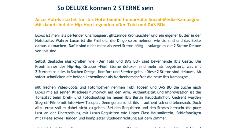 Selbst deutsche Musikgrößen wie «Der Tobi und DAS BO» sind bekennende ibis Gäste. Die Frontmänner der Hip-Hop Gruppe «Fünf Sterne deluxe» sind mehr als begeistert, was mit 2 Sternen so alles in Sachen Design, Komfort und Service geht. «Diese 2 Sterne sind deluxe». Ab sofort schmücken die beiden Lebemänner als Markenbotschafter die neue ibis Kampagne.