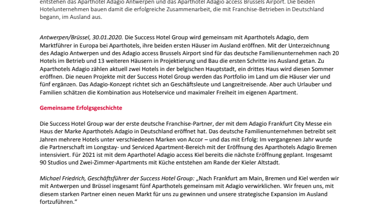Michael Friedrich, Geschäftsführer der Success Hotel Group: „Nach Frankfurt am Main, Bremen und Kiel werden wir mit Antwerpen und Brüssel insgesamt fünf Aparthotels gemeinsam mit Adagio verwirklichen. Wir freuen uns, mit diesem starken Partner einen neuen Markt für uns zu gewinnen und unsere strategische Expansion im Ausland fortzuführen.“