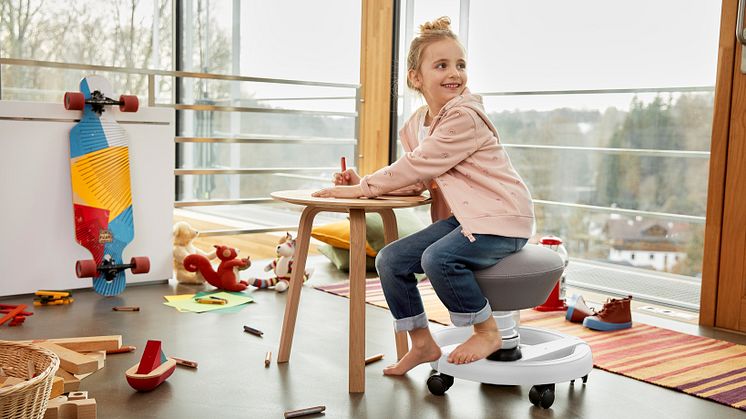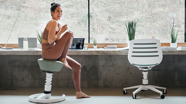 Schreibtisch im Home-Office, federgelagerter Aktiv-Hocker mit bewegungsfördernder Aeris 3D-Technologie
