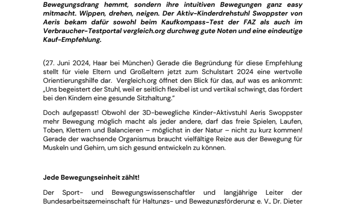 Gute Noten gab es für einen Stuhl, der Kinder nicht in ihrem natürlichen Bewegungsdrang hemmt, sondern ihre intuitiven Bewegungen ganz easy mitmacht. Wippen, drehen, neigen. Der Aktiv-Kinderdrehstuhl Swoppster von Aeris bekam dafür sowohl beim Kaufkompass-Test der FAZ als auch im Verbraucher-Testportal vergleich.org durchweg gute Noten und eine eindeutige Kauf-Empfehlung.