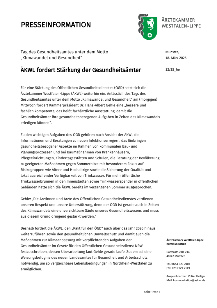 Für eine Stärkung des Öffentlichen Gesundheitsdienstes (ÖGD) setzt sich die Ärztekammer Westfalen-Lippe (ÄKWL) weiterhin ein. Anlässlich des Tags des Gesundheitsamtes unter dem Motto „Klimawandel und Gesundheit“ am (morgigen) Mittwoch fordert Kammerpräsident Dr. Hans-Albert Gehle eine „bessere und fachlich kompetente, das heißt fachärztliche Ausstattung, damit die Gesundheitsämter ihre gesundheitsbezogenen Aufgaben in Zeiten des Klimawandels erledigen können“.