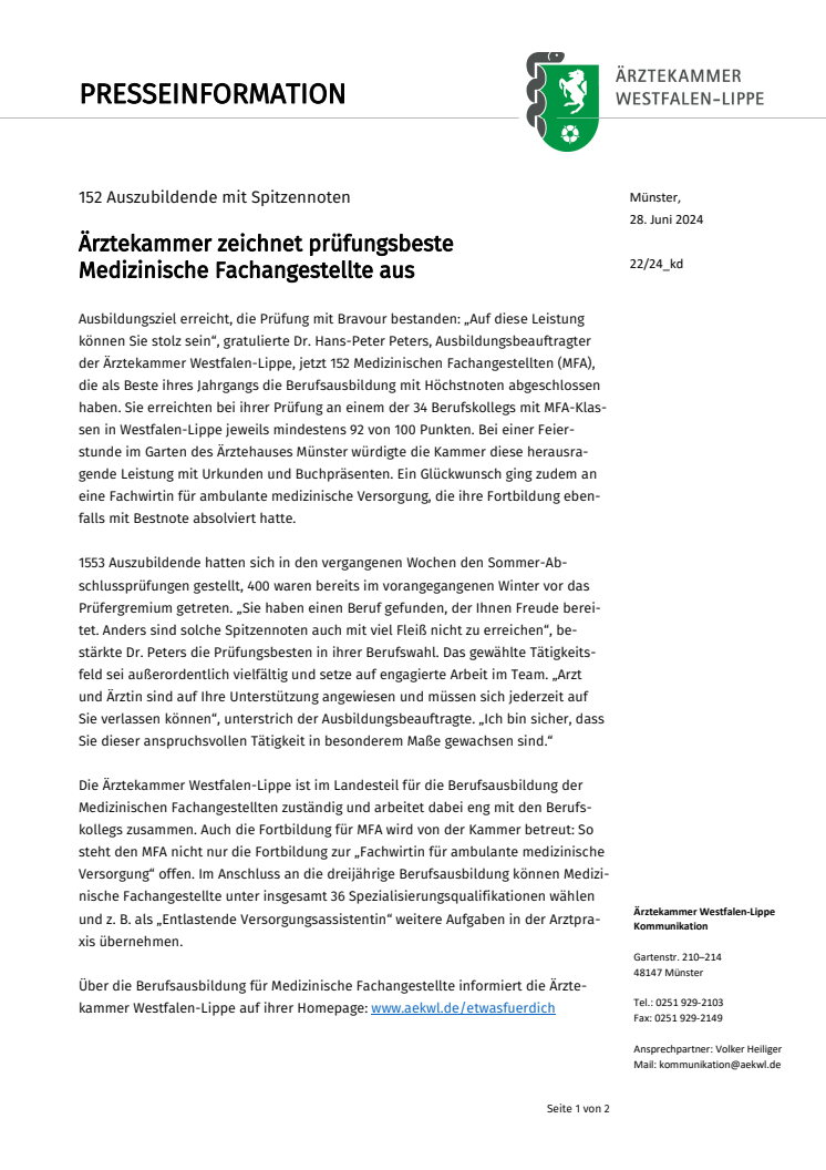Ausbildungsziel erreicht, die Prüfung mit Bravour bestanden: „Auf diese Leistung können Sie stolz sein“, gratulierte Dr. Hans-Peter Peters, Ausbildungsbeauftragter der Ärztekammer Westfalen-Lippe, jetzt 152 Medizinischen Fachangestellten (MFA), die als Beste ihres Jahrgangs die Berufsausbildung mit Höchstnoten abgeschlossen haben. Sie erreichten bei ihrer Prüfung an einem der 34 Berufskollegs mit MFA-Klassen in Westfalen-Lippe jeweils mindestens 92 von 100 Punkten. Bei einer Feierstunde im Garten des Ärztehauses Münster würdigte die Kammer diese herausragende Leistung mit Urkunden und Buchpräsenten. Ein Glückwunsch ging zudem an eine Fachwirtin für ambulante medizinische Versorgung, die ihre Fortbildung ebenfalls mit Bestnote absolviert hatte.
