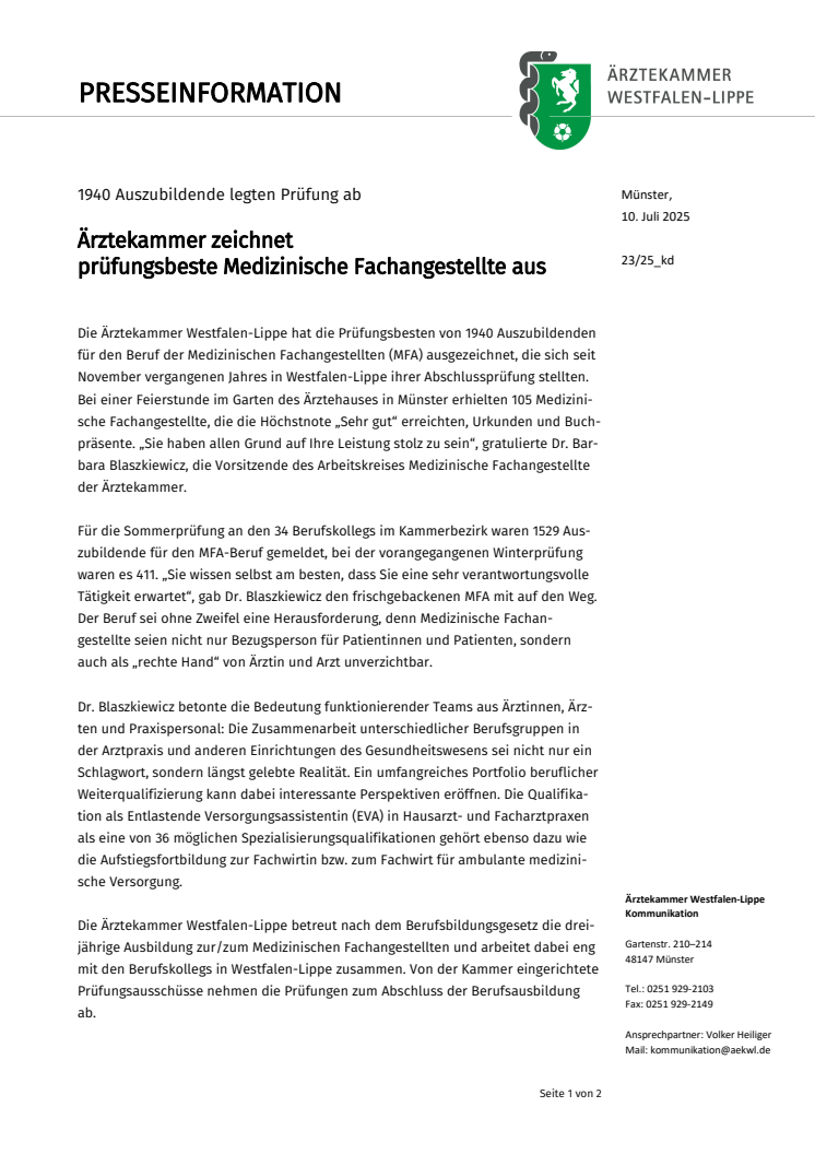 Für die Sommerprüfung an den 34 Berufskollegs im Kammerbezirk waren 1529 Auszubildende für den MFA-Beruf gemeldet, bei der vorangegangenen Winterprüfung waren es 411. „Sie wissen selbst am besten, dass Sie eine sehr verantwortungsvolle Tätigkeit erwartet“, gab Dr. Blaszkiewicz den frischgebackenen MFA mit auf den Weg. Der Beruf sei ohne Zweifel eine Herausforderung, denn Medizinische Fachangestellte seien nicht nur Bezugsperson für Patientinnen und Patienten, sondern auch als „rechte Hand“ von Ärztin und Arzt unverzichtbar.