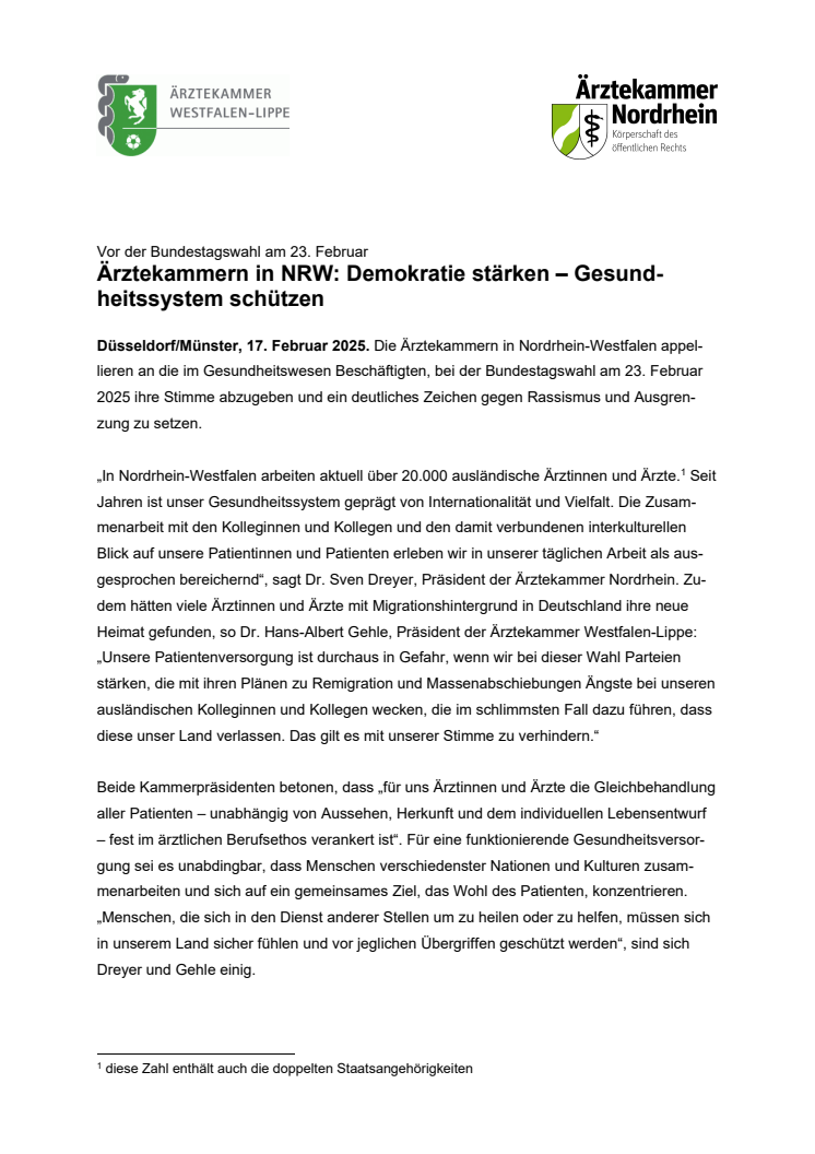 „In Nordrhein-Westfalen arbeiten aktuell über 20.000 ausländische Ärztinnen und Ärzte.¹ Seit Jahren ist unser Gesundheitssystem geprägt von Internationalität und Vielfalt. Die Zusammenarbeit mit den Kolleginnen und Kollegen und den damit verbundenen interkulturellen Blick auf unsere Patientinnen und Patienten erleben wir in unserer täglichen Arbeit als ausgesprochen bereichernd“, sagt Dr. Sven Dreyer, Präsident der Ärztekammer Nordrhein. Zudem hätten viele Ärztinnen und Ärzte mit Migrationshintergrund in Deutschland ihre neue Heimat gefunden, so Dr. Hans-Albert Gehle, Präsident der Ärztekammer Westfalen-Lippe: „Unsere Patientenversorgung ist durchaus in Gefahr, wenn wir bei dieser Wahl Parteien stärken, die mit ihren Plänen zu Remigration und Massenabschiebungen Ängste bei unseren ausländischen Kolleginnen und Kollegen wecken, die im schlimmsten Fall dazu führen, dass diese unser Land verlassen. Das gilt es mit unserer Stimme zu verhindern.“