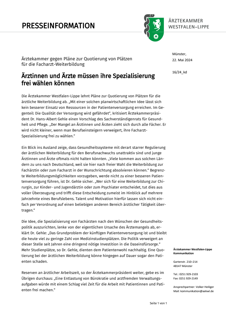 Die Idee, die Spezialisierung von Fachärzten nach den Wünschen der Gesundheitspolitik auszurichten, lenke von der eigentlichen Ursache des Ärztemangels ab, erklärt Dr. Gehle: „Das Grundproblem der künftigen Patientenversorgung ist und bleibt die heute viel zu geringe Zahl von Medizinstudienplätzen. Die Politik verweigert an dieser Stelle seit Jahren eine dringend nötige Investition in die Daseinsfürsorge.“ Mehr Studienplätze, so Dr. Gehle, dienten dem Patientenwohl nachhaltig. Eine Quotierung bei der ärztlichen Weiterbildung könne hingegen auf Dauer sogar den Patienten schaden.