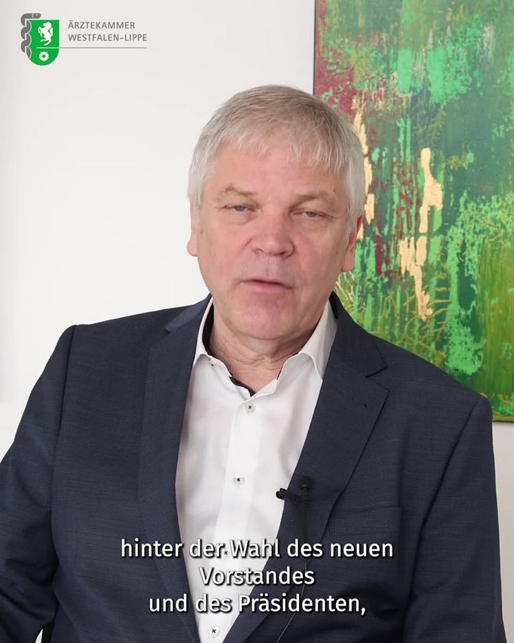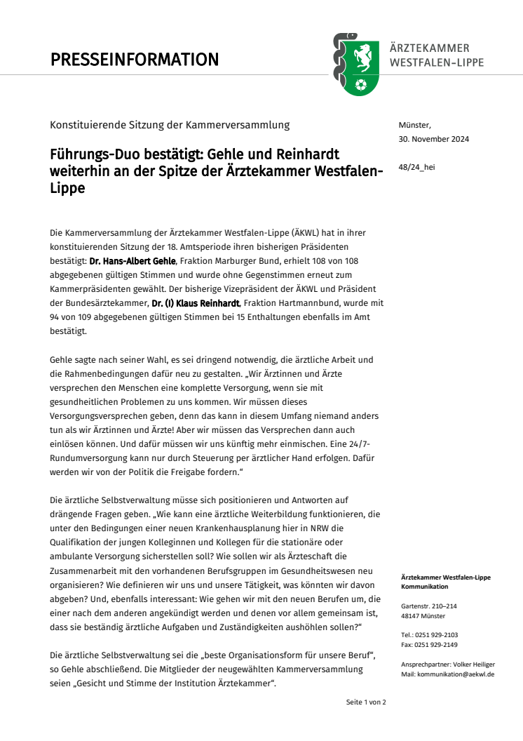Die Kammerversammlung der Ärztekammer Westfalen-Lippe (ÄKWL) hat in ihrer konstituierenden Sitzung der 18. Amtsperiode ihren bisherigen Präsidenten bestätigt: Dr. Hans-Albert Gehle, Fraktion Marburger Bund, erhielt 108 von 108 abgegebenen gültigen Stimmen und wurde erneut zum Kammerpräsidenten gewählt. Der bisherige Vizepräsident der ÄKWL und Präsident der Bundesärztekammer, Dr. (I) Klaus Reinhardt, Fraktion Hartmannbund, wurde mit 94 von 109 abgegebenen gültigen Stimmen bei 15 Enthaltungen ebenfalls im Amt bestätigt.