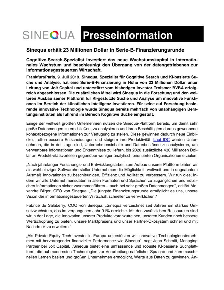 Sinequa, Spezialist für Cognitive Search und KI-basierte Suche und Analyse, hat eine Serie-B-Finanzierung in Höhe von 23 Millionen Dollar unter Leitung von Jolt Capital und unterstützt vom bisherigen Investor Troismer BVBA erfolgreich abgeschlossen. Die zusätzlichen Mittel wird Sinequa in die Forschung und den weiteren Ausbau seiner Plattform für KI-gestützte Suche und Analyse investieren.