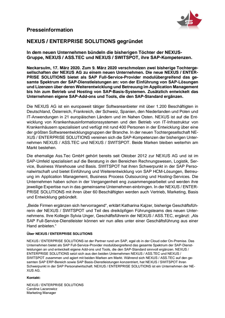 Zum 9. März 2020 verschmolzen zwei bisherige Tochtergesellschaften der NEXUS AG zu einem neuen Unternehmen. Die neue NEXUS / ENTERPRISE SOLUTIONS bietet als SAP Full-Service-Provider modulübergreifend das gesamte Spektrum der SAP-Dienstleistungen an.