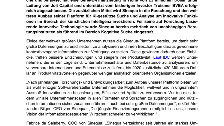 „Nach jahrelanger Forschungs- und Entwicklungsarbeit zum Aufbau unserer Plattform bieten wir als wohl einziger Softwarehersteller Unternehmen die Möglichkeit, weltweit und in ungeahntem Ausmaß Innovationen zu beschleunigen, Effizienz und Agilität zu verbessern. Wir tun dies, indem wir alle Unternehmensdaten in allen Formaten und Sprachen zu zugänglichen und nützlichen Informationen sicher zusammenführen – auch bei sehr großen Datenmengen", erklärt Alexandre Bilger, CEO von Sinequa. „Die jüngste Finanzierungsrunde ermöglicht es uns, unsere Vision der informationsgesteuerten Wirtschaft schneller zu verwirklichen.“