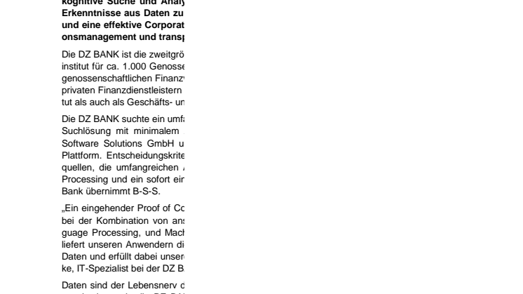 Die DZ BANK suchte ein umfassendes und zugleich flexibles System, mit dem sie ihre bisherige Suchlösung mit minimalem Aufwand ablösen könnte. Auf Empfehlung der B-S-S Business Software Solutions GmbH und nach eingehender Bewertung wählte die Bank die Sinequa-Plattform. Entscheidungskriterien waren deren breite Konnektivität an verschiedenste Datenquellen, die umfangreichen Administrationsfunktionalitäten, fortschrittliches Natural Language Processing und ein sofort einsatzbereites Frontend. Die Implementierung der Plattform bei der Bank übernimmt B-S-S.