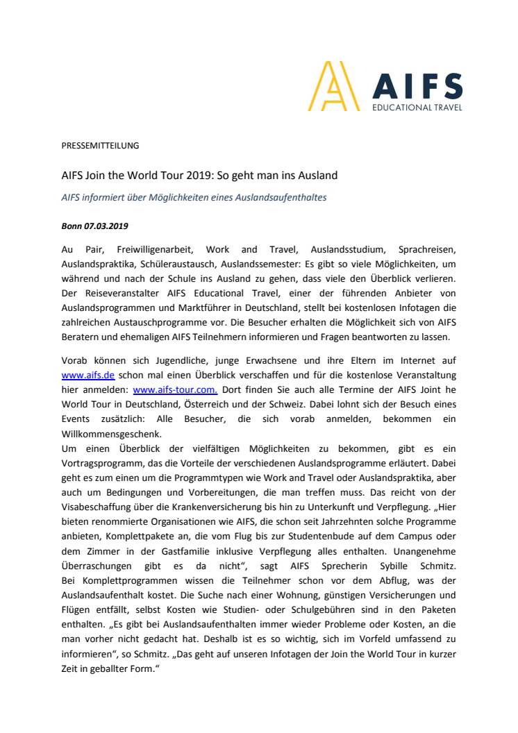 AIFS, einer der führenden Anbieter für Lernen und Jobben im Ausland, geht auf große Tour und wird 2019 eine Reihe kostenloser Infoveranstaltungen in Deutschland, Österreich und der Schweiz anbieten, bei denen sich Besucher über Möglichkeiten eines Auslandsaufenthaltes informieren können.