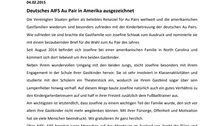 Über AIFS: AIFS bereitet junge Menschen auf das Abenteuer im Ausland vor, bucht die Flüge und unterstützt vor Ort. Weitere Länder für Au Pair Aufenthalte sind Kanada, Australien, Neuseeland und China. Die kostenlosen Informationsbroschüren und weitere Infos zu den Programmen gibt es bei AIFS, Friedensplatz 1, 53111 Bonn - zu erreichen unter 0228-957300, im Internet auf www.aifs.de oder über die offizielle AIFS facebook Seite www.facebook.com/AIFS.JOiNTHEWORLD.