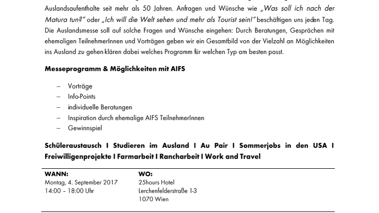 AIFS – eine der führenden Agenturen für Auslandsaufenthalte – organisiert, begleitet und erfüllt Auslandsaufenthalte seit mehr als 50 Jahren. Anfragen und Wünsche wie „Was soll ich nach der Matura tun?“ oder „Ich will die Welt sehen und mehr als Tourist sein!“ beschäftigen uns jeden Tag. Die Auslandsmesse soll auf solche Fragen und Wünsche eingehen: Durch Beratungen, Gesprächen mit ehemaligen TeilnehmerInnen und Vorträgen geben wir ein Gesamtbild von der Vielzahl an Möglichkeiten ins Ausland zu gehen klären dabei welches Programm für welchen Typ am besten passt.