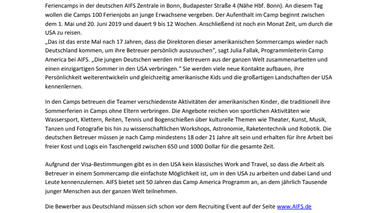 Die Bewerber aus Deutschland müssen sich schon vor dem Recruiting Event auf der Seite www.aifs.de anmelden und eine Kurzbewerbung ausfüllen. Dazu sollten sie sich im Internet auch die elf Camps mit ihren unterschiedlichen Schwerpunkten genauer anschauen, um das richtige Camp auszuwählen. Wer am Recruiting Event in Bonn teilnimmt und 2019 in die USA geht, erhält von AIFS zusätzlich 100 Euro Rabatt auf das Camp America Programm.