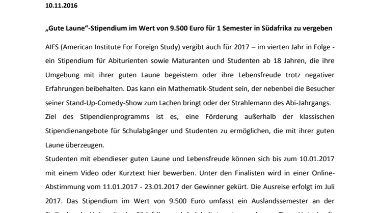 AIFS (American Institute For Foreign Study) vergibt auch für 2017 – im vierten Jahr in Folge - ein Stipendium für Abiturienten sowie Maturanten und Studenten ab 18 Jahren, die ihre Umgebung mit ihrer guten Laune begeistern oder ihre Lebensfreude trotz negativer Erfahrungen beibehalten. Das kann ein Mathematik-Student sein, der nebenbei die Besucher seiner Stand-Up-Comedy-Show zum Lachen bringt oder der Strahlemann des Abi-Jahrgangs.