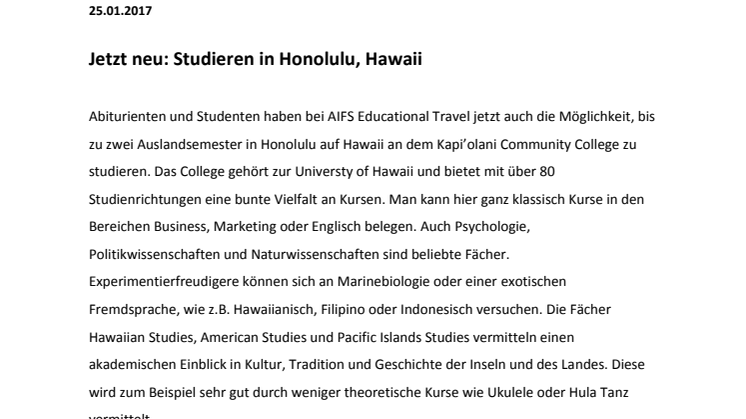 Abiturienten und Studenten haben bei AIFS Educational Travel jetzt auch die Möglichkeit, bis zu zwei Auslandsemester in Honolulu auf Hawaii an dem Kapi’olani Community College zu studieren. Das College gehört zur Universty of Hawaii und bietet mit über 80 Studienrichtungen eine bunte Vielfalt an Kursen. Man kann hier ganz klassisch Kurse in den Bereichen Business, Marketing oder Englisch belegen. Auch Psychologie, Politikwissenschaften und Naturwissenschaften sind beliebte Fächer. Experimentierfreudigere können sich an Marinebiologie oder einer exotischen Fremdsprache, wie z.B. Hawaiianisch, Filipino oder Indonesisch versuchen. Die Fächer Hawaiian Studies, American Studies und Pacific Islands Studies vermitteln einen akademischen Einblick in Kultur, Tradition und Geschichte der Inseln und des Landes. Diese wird zum Beispiel sehr gut durch weniger theoretische Kurse wie Ukulele oder Hula Tanz vermittelt.