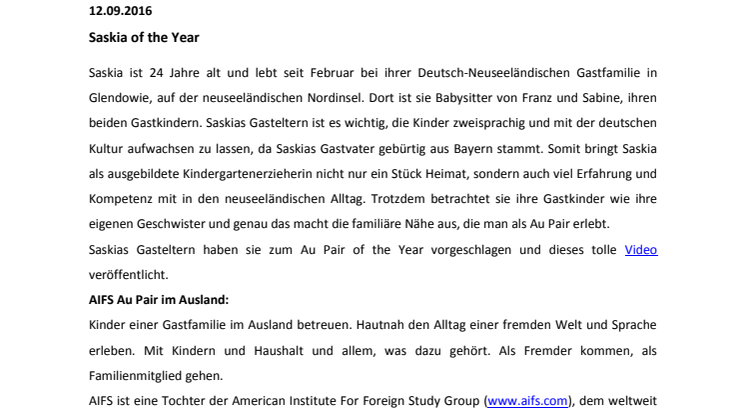 Saskias Gasteltern haben sie zum Au Pair of the Year vorgeschlagen und dieses tolle Video veröffentlicht.