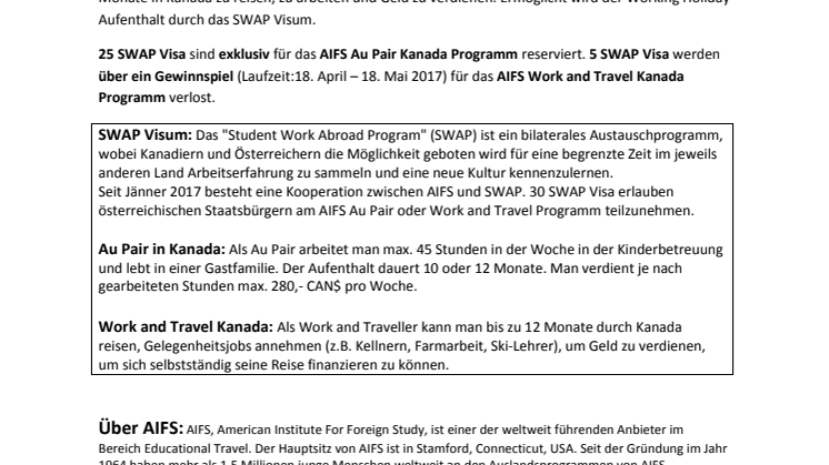 25 SWAP Visa sind exklusiv für das AIFS Au Pair Kanada Programm reserviert. 5 SWAP Visa werden über ein Gewinnspiel (Laufzeit:18. April – 18. Mai 2017) für das AIFS Work and Travel Kanada Programm verlost.