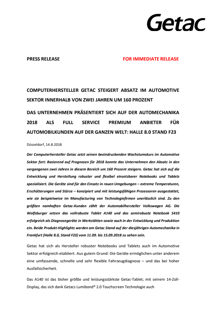 COMPUTERHERSTELLER GETAC STEIGERT ABSATZ IM AUTOMOTIVE SEKTOR INNERHALB VON ZWEI JAHREN UM 160 PROZENT