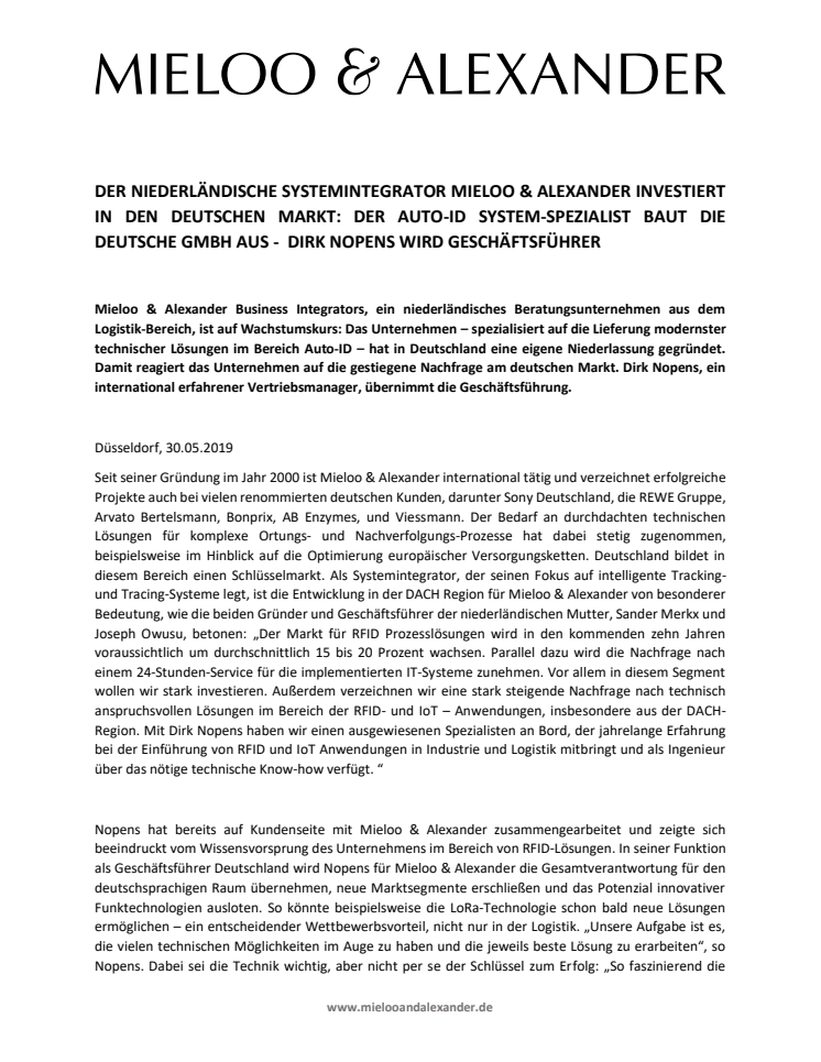 DER NIEDERLÄNDISCHE SYSTEMINTEGRATOR MIELOO & ALEXANDER INVESTIERT IN DEN DEUTSCHEN MARKT: DER AUTO-ID SYSTEM-SPEZIALIST BAUT DIE DEUTSCHE GMBH AUS - DIRK NOPENS WIRD GESCHÄFTSFÜHRER