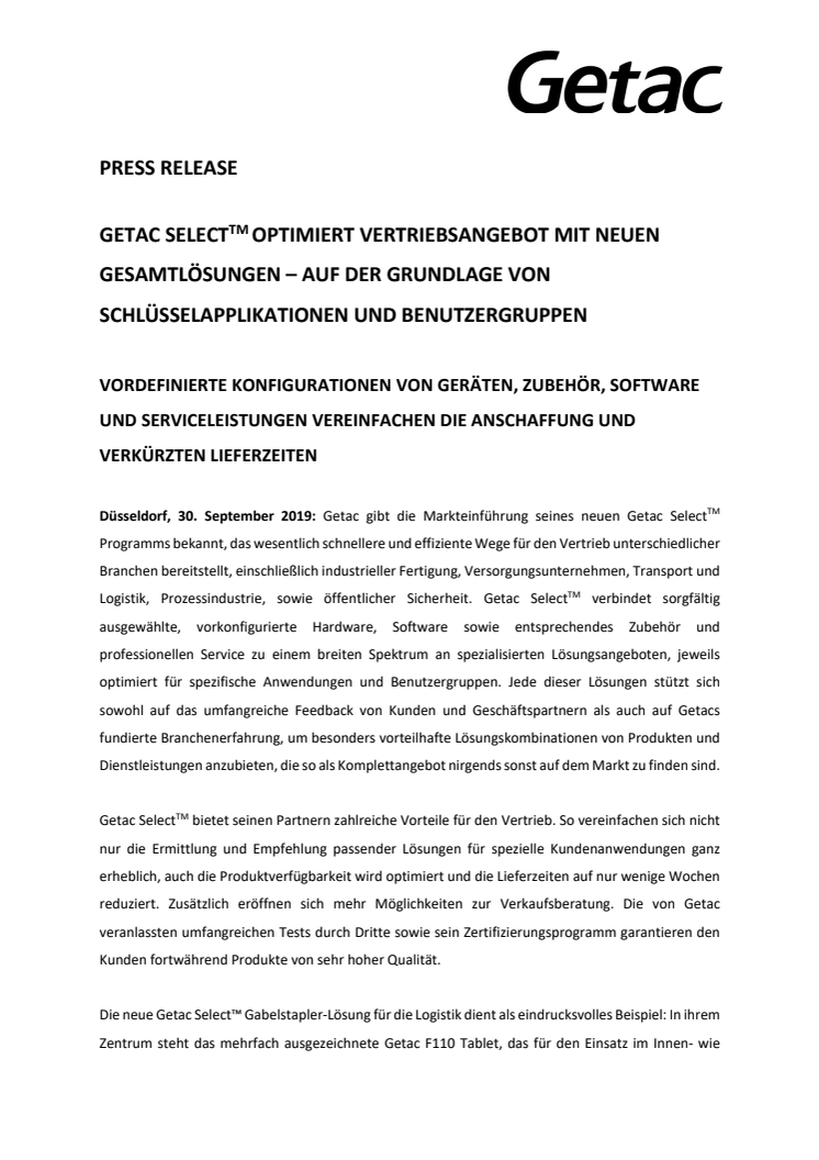 GETAC SELECT TM OPTIMIERT VERTRIEBSANGEBOT MIT NEUEN GESAMTLÖSUNGEN – AUF DER GRUNDLAGE VON SCHLÜSSELAPPLIKATIONEN UND BENUTZERGRUPPEN
