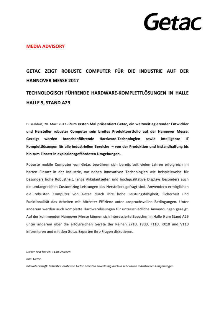 GETAC ZEIGT ROBUSTE COMPUTER FÜR DIE INDUSTRIE AUF DER HANNOVER MESSE 2017