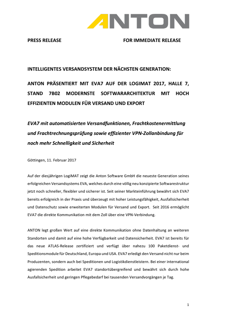 INTELLIGENTES VERSANDSYSTEM DER NÄCHSTEN GENERATION: ANTON PRÄSENTIERT MIT EVA7 AUF DER LOGIMAT 2017, HALLE 7, STAND 7B02 MODERNSTE SOFTWARARCHITEKTUR MIT HOCH EFFIZIENTEN MODULEN FÜR VERSAND UND EXPORT