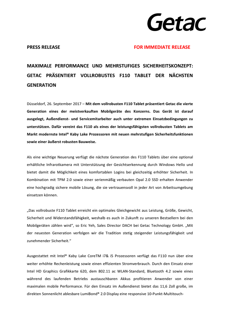 MAXIMALE PERFORMANCE UND MEHRSTUFIGES SICHERHEITSKONZEPT: GETAC PRÄSENTIERT VOLLROBUSTES F110 TABLET DER NÄCHSTEN GENERATION