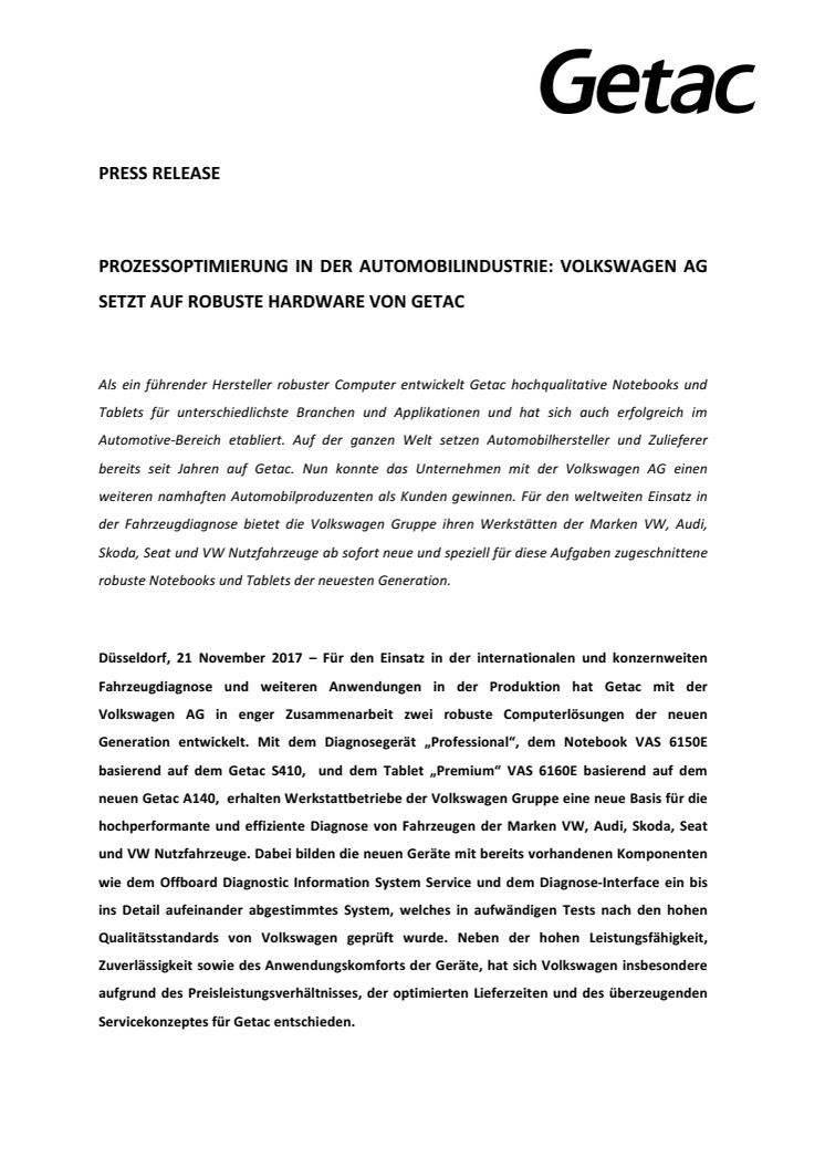 Als ein führender Hersteller robuster Computer entwickelt Getac hochqualitative Notebooks und Tablets für unterschiedlichste Branchen und Applikationen und hat sich auch erfolgreich im Automotive-Bereich etabliert. Nun konnte das Unternehmen mit der Volkswagen AG einen weiteren namhaften Automobilproduzenten als Kunden gewinnen.