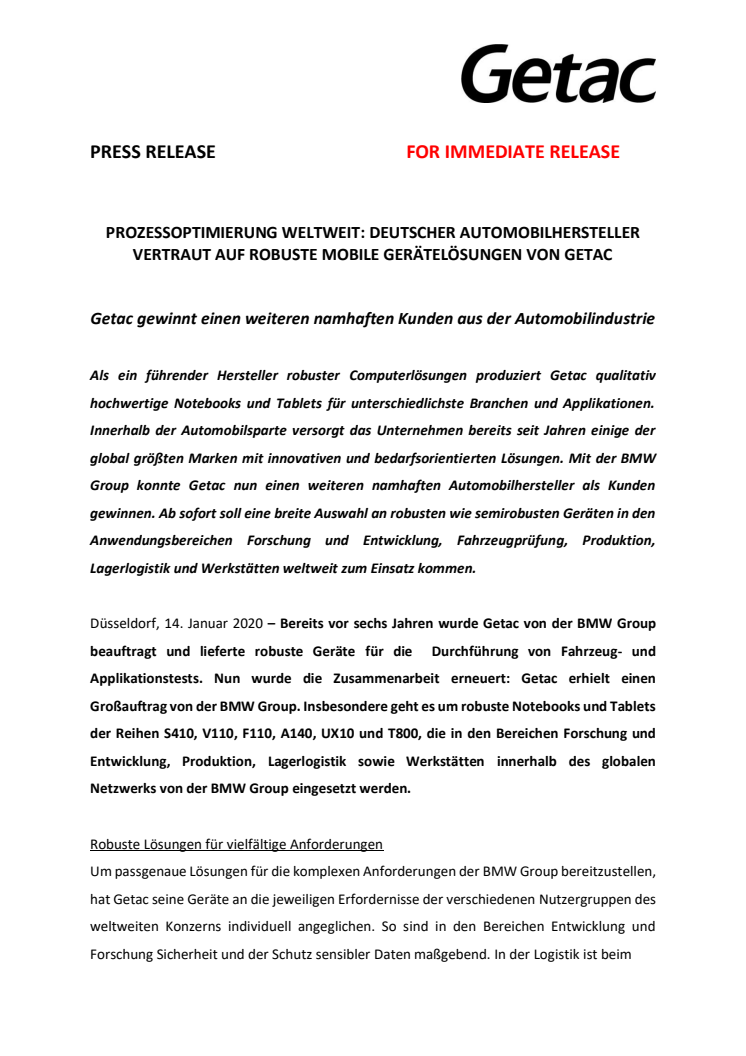 Als ein führender Hersteller robuster Computerlösungen produziert Getac qualitativ hochwertige Notebooks und Tablets für unterschiedlichste Branchen. Innerhalb der Automobilsparte versorgt das Unternehmen bereits seit Jahren einige der global größten Marken mit innovativen Lösungen. Mit der BMW Group konnte Getac nun einen weiteren namhaften Automobilhersteller als Kunden gewinnen.