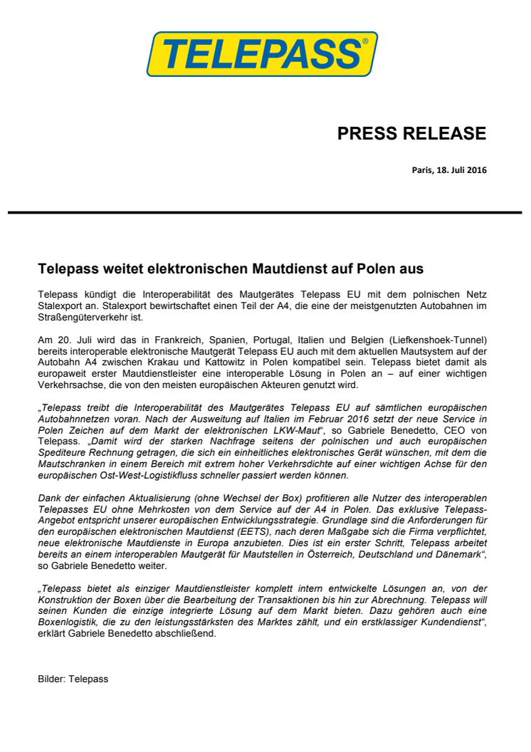 Telepass kündigt die Interoperabilität des Mautgerätes Telepass EU mit dem polnischen Netz Stalexport an. Stalexport bewirtschaftet einen Teil der A4, die eine der meistgenutzten Autobahnen im Straßengüterverkehr ist.