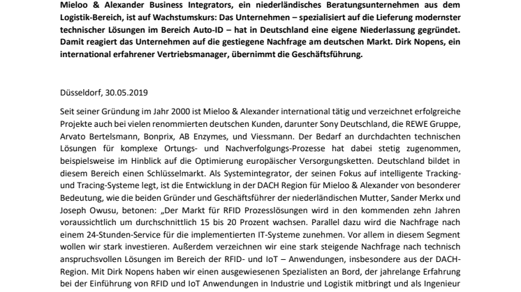 Seit seiner Gründung im Jahr 2000 ist Mieloo & Alexander international tätig und verzeichnet erfolgreiche Projekte auch bei vielen renommierten deutschen Kunden, darunter Sony Deutschland, die REWE Gruppe, Arvato Bertelsmann, Bonprix, AB Enzymes, und Viessmann. Der Bedarf an durchdachten technischen Lösungen für komplexe Ortungs- und Nachverfolgungs-Prozesse hat dabei stetig zugenommen, beispielsweise im Hinblick auf die Optimierung europäischer Versorgungsketten. Deutschland bildet in diesem Bereich einen Schlüsselmarkt. Als Systemintegrator, der seinen Fokus auf intelligente Tracking- und Tracing-Systeme legt, ist die Entwicklung in der DACH Region für Mieloo & Alexander von besonderer Bedeutung, wie die beiden Gründer und Geschäftsführer der niederländischen Mutter, Sander Merkx und Joseph Owusu, betonen: „Der Markt für RFID Prozesslösungen wird in den kommenden zehn Jahren voraussichtlich um durchschnittlich 15 bis 20 Prozent wachsen. Parallel dazu wird die Nachfrage nach einem 24-Stunden-Service für die implementierten IT-Systeme zunehmen. Vor allem in diesem Segment wollen wir stark investieren. Außerdem verzeichnen wir eine stark steigende Nachfrage nach technisch anspruchsvollen Lösungen im Bereich der RFID- und IoT – Anwendungen, insbesondere aus der DACH-Region. Mit Dirk Nopens haben wir einen ausgewiesenen Spezialisten an Bord, der jahrelange Erfahrung bei der Einführung von RFID und IoT Anwendungen in Industrie und Logistik mitbringt und als Ingenieur über das nötige technische Know-how verfügt. “