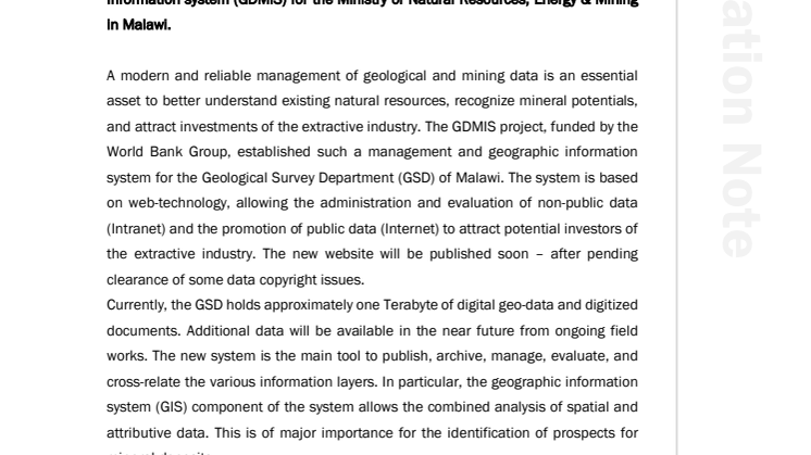 A modern and reliable management of geological and mining data is an essential asset to better understand existing natural resources, recognize mineral potentials, and attract investments of the extractive industry. The GDMIS project, funded by the World Bank Group, established such a management and geographic information system for the Geological Survey Department (GSD) of Malawi. The system is based on web-technology, allowing the administration and evaluation of non-public data (Intranet) and the promotion of public data (Internet) to attract potential investors of the extractive industry. The new website will be published soon – after pending clearance of some data copyright issues.