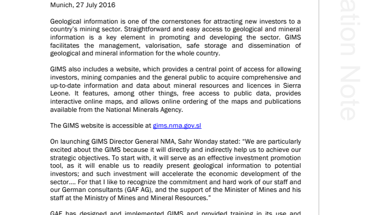 On launching GIMS Director General NMA, Sahr Wonday stated: “We are particularly excited about the GIMS because it will directly and indirectly help us to achieve our strategic objectives. To start with, it will serve as an effective investment promotion tool, as it will enable us to readily present geological information to potential investors; and such investment will accelerate the economic development of the sector.... For that I like to recognize the commitment and hard work of our staff and our German consultants (GAF AG), and the support of the Minister of Mines and his staff at the Ministry of Mines and Mineral Resources.”