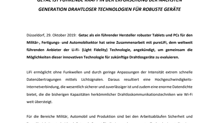 GETAC GIBT PARTNERSCHAFT MIT pureLiFi BEKANNT, UM ROBUSTE LI-FI FÄHIGE GERÄTE AUF DEN MARKT ZU BRINGEN