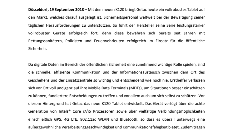 Da digitale Daten im Bereich der öffentlichen Sicherheit eine zunehmend wichtige Rolle spielen, sind die schnelle, effiziente Kommunikation und der Informationsaustausch zwischen dem Ort des Geschehens und der Einsatzzentrale so wichtig und entscheidend wie noch nie. Ersthelfer verlassen sich vor Ort voll und ganz auf ihre Mobile Data Terminals (MDTs), um Situationen besser einschätzen zu können, fundiertere Entscheidungen zu treffen und vor allem auch um sich selbst zu schützen. Vor diesem Hintergrund hat Getac das neue K120 Tablet entwickelt: Das Gerät verfügt über die achte Generation von Intels® Core i7/i5 Prozessoren sowie über vielfältige Verbindungsmöglichkeiten einschließlich GPS, 4G LTE, 802.11ac WLAN und Bluetooth, so dass es überall unterwegs eine außergewöhnliche Verarbeitungsgeschwindigkeit und Kommunikationsfähigkeit bietet. Zudem tragen das 12,5 Zoll große Multi-Touch-Display und robuste Sicherheitsfunktionen wie eine mehrstufige Authentisierung, ein Fingerabdrucksensor, ein Smartcard-Reader oder die Möglichkeit der Authentisierung mittels RFID zu einer optimalen Funktionalität und Sicherheit auch in höchst anspruchsvollsten Arbeitsumgebungen bei.