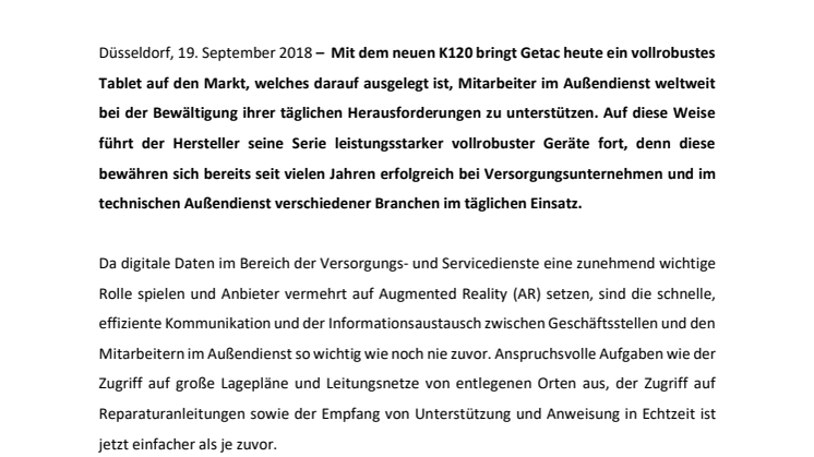 GETAC PRÄSENTIERT VOLLROBUSTES K120 TABLET FÜR VERSORGUNGSUNTERNEHMEN UND TECHNISCHEN AUSSENDIENST