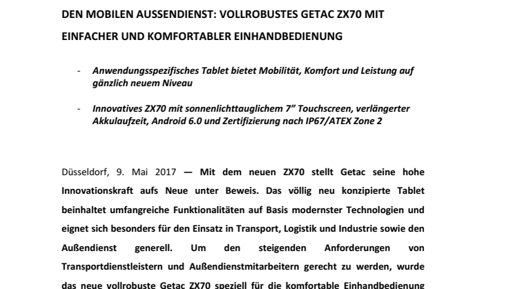 Düsseldorf, 9. Mai 2017 — Mit dem neuen ZX70 stellt Getac seine hohe Innovationskraft aufs Neue unter Beweis. Das völlig neu konzipierte Tablet beinhaltet umfangreiche Funktionalitäten auf Basis modernster Technologien und eignet sich besonders für den Einsatz in Transport, Logistik und Industrie sowie den Außendienst generell. Um den steigenden Anforderungen von Transportdienstleistern und Außendienstmitarbeitern gerecht zu werden, wurde das neue vollrobuste Getac ZX70 speziell für die komfortable Einhandbedienung während des Einsatzes in abgelegenen und anspruchsvollen Umgebungen entwickelt. Das 7“ große Android-Tablet verfügt über ein äußerst stabiles Gehäuse sowie die längste Batterielaufzeit seiner Klasse. Zudem ist das Gerät nach IP67 als wasserdicht bis zu einem Meter Tiefe und nach MIL-STD810G als resistent gegen Stürze aus bis zu 1,80 Meter zertifiziert. Getac bietet für das ZX70 seine vollumfassende und branchenführende Dreijahresgarantie.