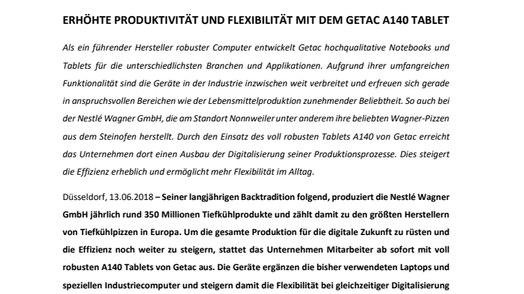 Düsseldorf, 13.06.2018 – Seiner langjährigen Backtradition folgend, produziert die Nestlé Wagner GmbH jährlich rund 350 Millionen Tiefkühlprodukte und zählt damit zu den größten Herstellern von Tiefkühlpizzen in Europa. Um die gesamte Produktion für die digitale Zukunft zu rüsten und die Effizienz noch weiter zu steigern, stattet das Unternehmen Mitarbeiter ab sofort mit voll robusten A140 Tablets von Getac aus. Die Geräte ergänzen die bisher verwendeten Laptops und speziellen Industriecomputer und steigern damit die Flexibilität bei gleichzeitiger Digitalisierung der Produktionsprozesse.