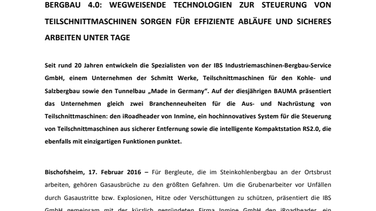 Seit rund 20 Jahren entwickeln die Spezialisten von der IBS Industriemaschinen-Bergbau-Service GmbH, einem Unternehmen der Schmitt Werke, Teilschnittmaschinen für den Kohle- und Salzbergbau sowie den Tunnelbau „Made in Germany“. Auf der diesjährigen BAUMA präsentiert das Unternehmen gleich zwei Branchenneuheiten für die Aus- und Nachrüstung von Teilschnittmaschinen: den iRoadheader von Inmine, ein hochinnovatives System für die Steuerung von Teilschnittmaschinen aus sicherer Entfernung sowie die intelligente Kompaktstation RS2.0, die ebenfalls mit einzigartigen Funktionen punktet.