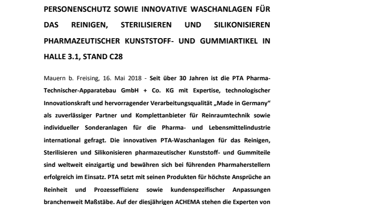 Mauern b. Freising, 16. Mai 2018 - Seit über 30 Jahren ist die PTA Pharma-Technischer-Apparatebau GmbH + Co. KG mit Expertise, technologischer Innovationskraft und hervorragender Verarbeitungsqualität „Made in Germany“ als zuverlässiger Partner und Komplettanbieter für Reinraumtechnik sowie individueller Sonderanlagen für die Pharma- und Lebensmittelindustrie international gefragt. Die innovativen PTA-Waschanlagen für das Reinigen, Sterilisieren und Silikonisieren pharmazeutischer Kunststoff- und Gummiteile sind weltweit einzigartig und bewähren sich bei führenden Pharmaherstellern erfolgreich im Einsatz. PTA setzt mit seinen Produkten für höchste Ansprüche an Reinheit und Prozesseffizienz sowie kundenspezifischer Anpassungen branchenweit Maßstäbe. Auf der diesjährigen ACHEMA stehen die Experten von PTA in Halle 3.1 am Stand C28 für weitere Informationen und Beratungen zur Verfügung.