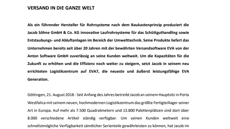 Als ein führender Hersteller für Rohrsysteme nach dem Baukastenprinzip produziert die Jacob Söhne GmbH & Co. KG innovative Laufrohrsysteme für das Schüttguthandling sowie Entstaubungs- und Abluftanlagen im Bereich der Umwelttechnik. Seine Produkte liefert das Unternehmen bereits seit über 20 Jahren mit der bewährten Versandsoftware EVA von der Anton Software GmbH zuverlässig an seine Kunden weltweit. Um die Kapazitäten für die Zukunft zu erhöhen und die Effizienz noch weiter zu steigern, setzt Jacob in seinem neu errichteten Logistikzentrum auf EVA7, die neueste und äußerst leistungsfähige EVA Generation.