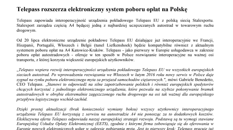 „Telepass wspiera rozwój interoperacyjności urządzenia pokładowego Telepass EU we wszystkich europejskich sieciach autostrad. Po wprowadzeniu rozwiązania we Włoszech w lutym 2016 roku nowy serwis w Polsce daje sygnał na rynku poboru elektronicznego myta za przejazd samochodów ciężarowych.", mówi Gabriele Benedetto, CEO Telepass. „Stanowi to odpowiedź na silne zapotrzebowanie polskich i również europejskich spedytorów chcących korzystać z jednolitego elektronicznego urządzenia, które pozwala na szybsze pokonywanie bramek autostradowych w obrębie ekstremalnie zagęszczonego ruchu drogowego na osi tak ważnej dla europejskiego przepływu logistycznego wschód-zachód.