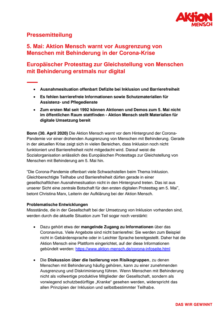 5. Mai: Aktion Mensch warnt vor Ausgrenzung von Menschen mit Behinderung in der Corona-Krise