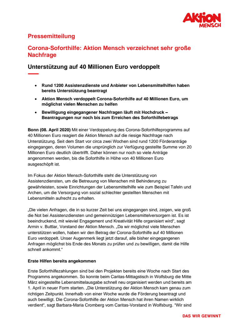 Corona-Soforthilfe: Aktion Mensch verzeichnet sehr große Nachfrage