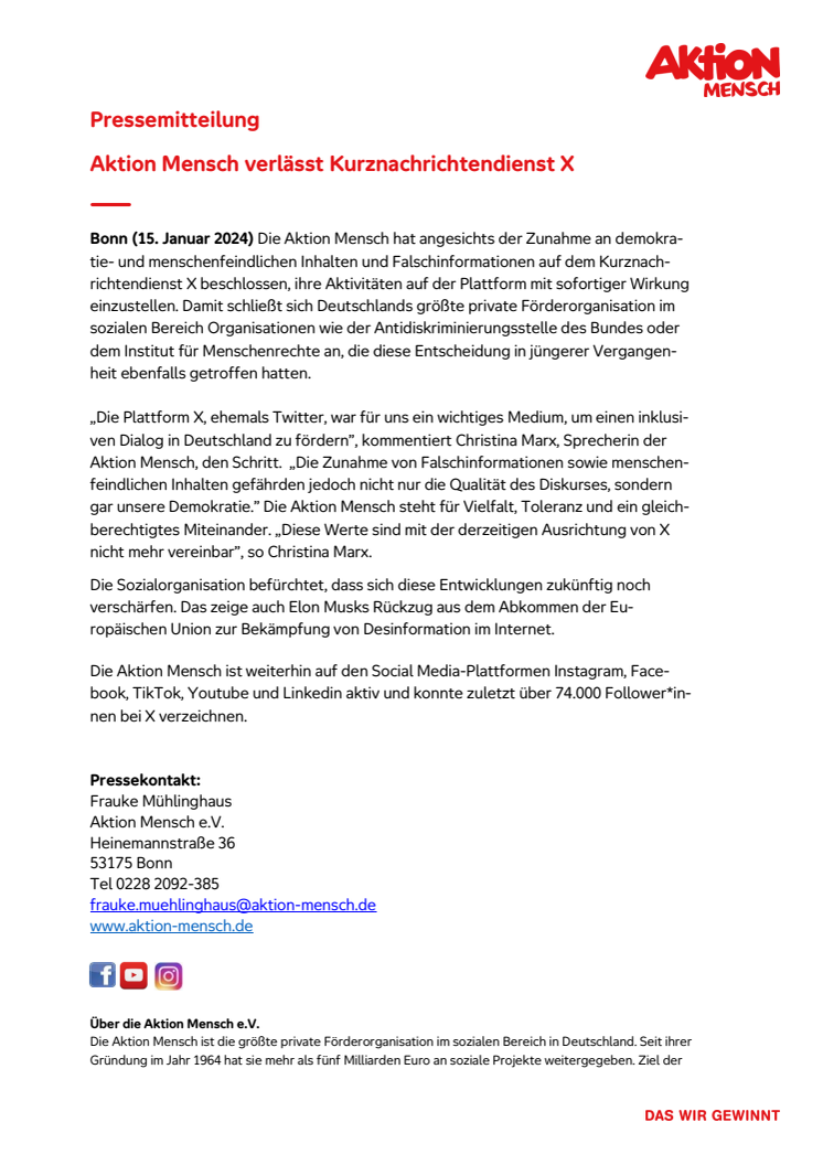 Die Aktion Mensch stellt ihre Aktivitäten auf der Plattform X ein