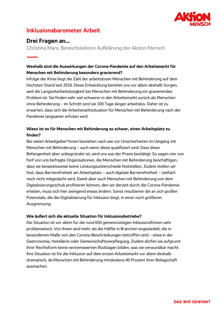 Inklusionsbarometer Arbeit / Drei Fragen an... Christina Marx, Bereichsleiterin Aufklärung der Aktion Mensch