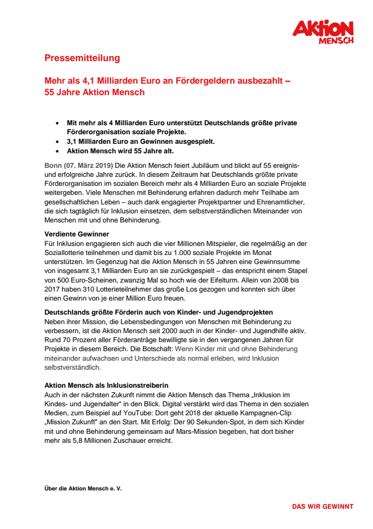 Mehr als 4,1 Milliarden Euro an Fördergeldern ausbezahlt – 55 Jahre Aktion Mensch